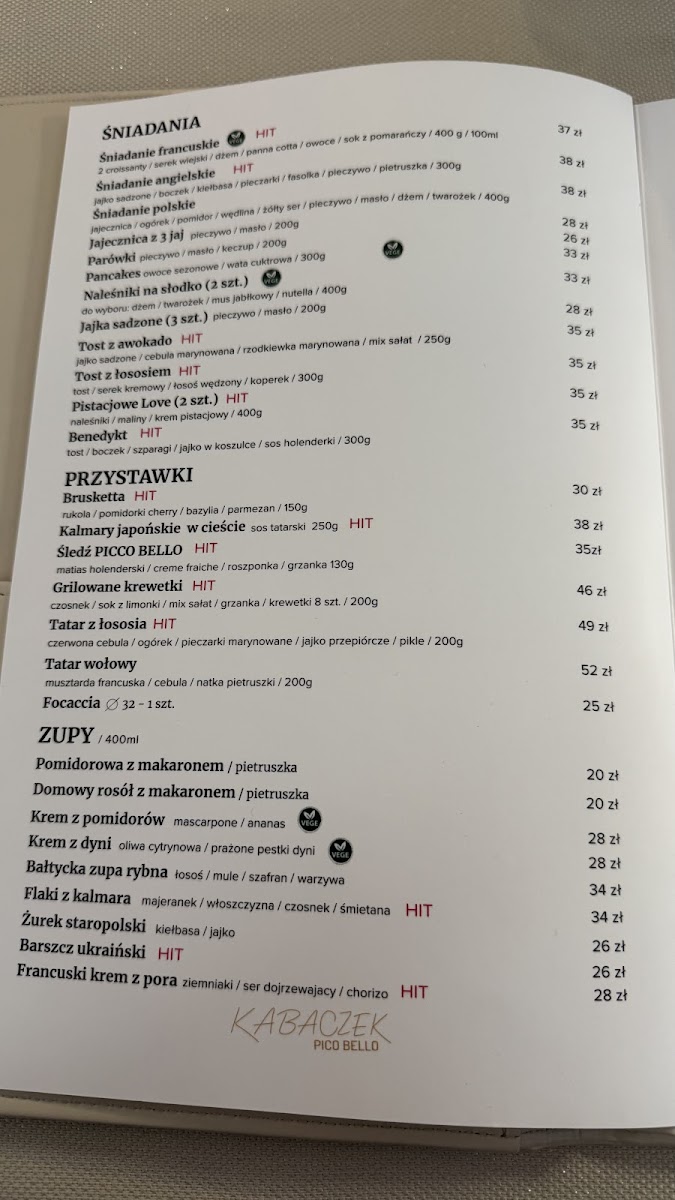 Introducing the menu at KABACZEK PICO BELLO, owned by Piotr and Magdalena Szpak, is a delightful experience for any food enthusiast visiting Ustronie Morskie, Poland. Located at Chrobrego 13B, this charming eatery showcases a fusion of traditional Polish flavors with a modern twist.